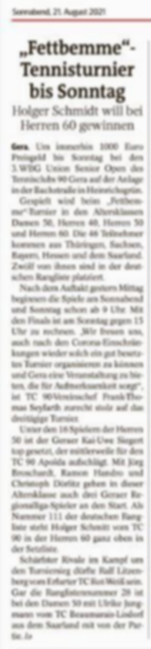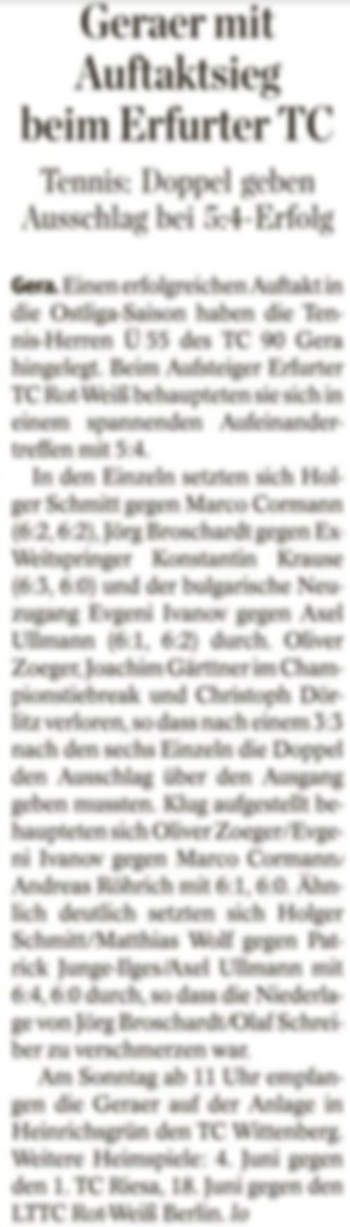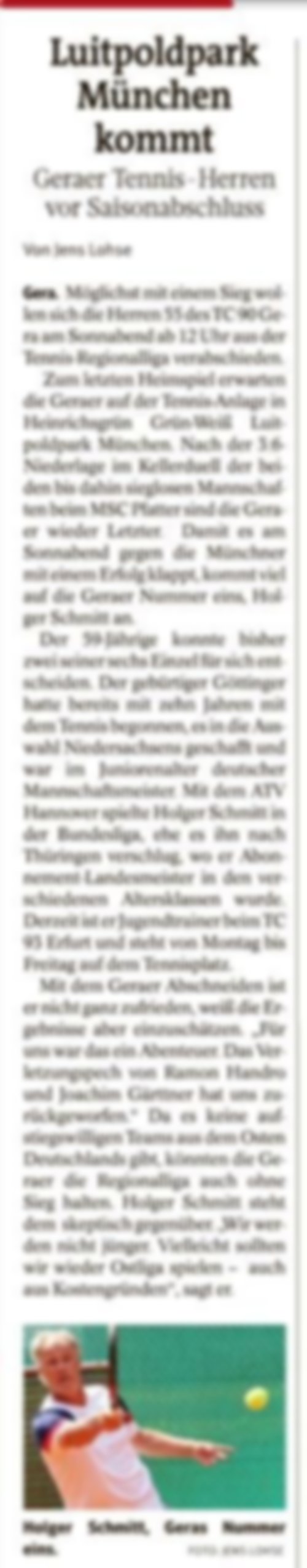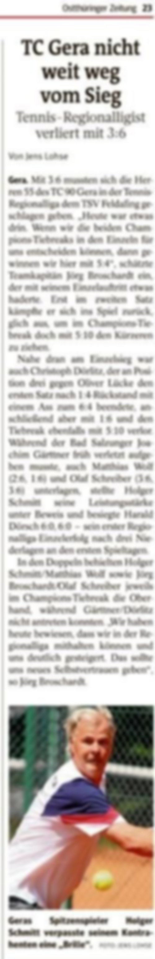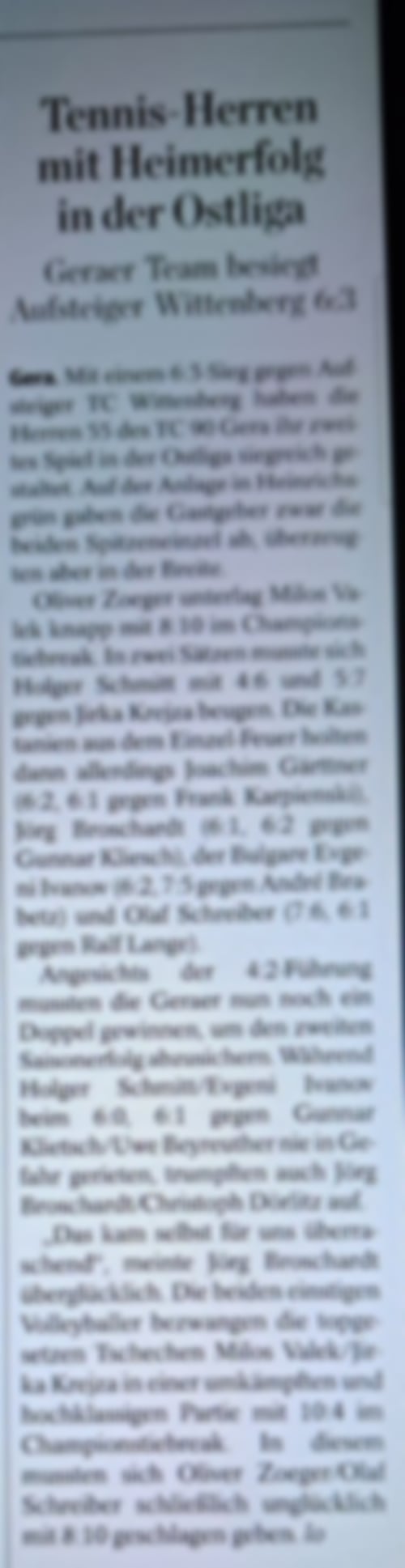 Auch bei ihrer Tennis Heimspiel Premiere waren die Herren 55 vom TC 90 Gera erwartungsgemäß chancenlos. Denn in der Partie gegen den Mitfavoriten auf den Meistertitel, dem TC Großhesselohe, gab es trotz hoher Kampfmoral eine klare 0:9 Klattsche. Im mit Spannung erwarteten Spitzenspiel, dem einzigen welches über drei Sätze ging, hatte Geras Nummer eins Holger Schmitt einen blendenden Auftakt. Denn im ersten Satz ließ er seinen Gegner Andreas Hampel, immerhin Sechster in der Deutschen Rangliste seiner Altersklasse, beim 6:1 nie die Spur einer Chance. Doch der Bayer konnte anschließen duch Satzgewinne mit 6:2 und 10:4 die auf technisch hohem Niveau stehende Auseinandersetzung noch zu seinem Gunsten entscheiden. „Die Niederlage soll aber keine Entschuldigung sein, dass mich ab Mitte des 2. Satzes muskuläre Probleme zu schaffen machten“, so der faire Verlierer. Für alle andere Geraer, welche ohne den verletzten Dr. Handro und Matthias Wolf auskommen mußten, war dagegen schon nach zwei Sätzen Schluss. So auch für Kapitän Jörg Broschardt, der gegen Bernhard Essmann mit 1:6 und 1:6 unterlag. Besser erging es jedoch auch seinen Teamkameraden Joachim Gärttner beim 1:6 und 2:6, Christoph Dörlitz beim 0:6 und 0:6, Olaf Schreiber beim 2:6 und 2:6 spowie Reiner Theiß beim ebenfalls 2:6 und 2:6. Und auch in den abschließenden drei Doppel gab es keine Gewinnchance für die Ostthüringer. Die leider nur wenigen Zuschauer haben dennoch gutklassiges Tennis gesehen.